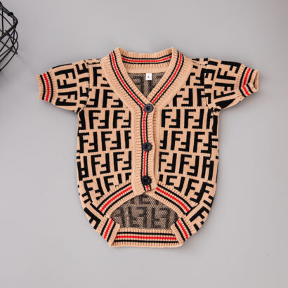 This designer dog sweater is a timeless piece of luxury dog clothes, featuring the iconic FF monogram pattern that mirrors high-end fashion. Crafted from soft, breathable knit fabric, it’s a standout in designer pet apparel—keeping your pup cozy while exuding sophistication. Available in sizes for small to medium breeds, it’s the perfect addition to any designer pet products collection.